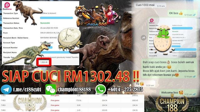 Dinasour tak pupus lagi ‼️ Masih hidup dlm MEGA888 slot T-REX 😍 Bagi untung dekat member CHAMPION188 😘 Dpt FREE GAME siap CUCI RM1302.42 😁 Disini kami dapat Janji 💯 Gentle Cuci 😎 24Jam Online Servis utk anda deposit , main dan ONG ONG cuci ‼️ Tak perlu tunggu lama2 🤩
